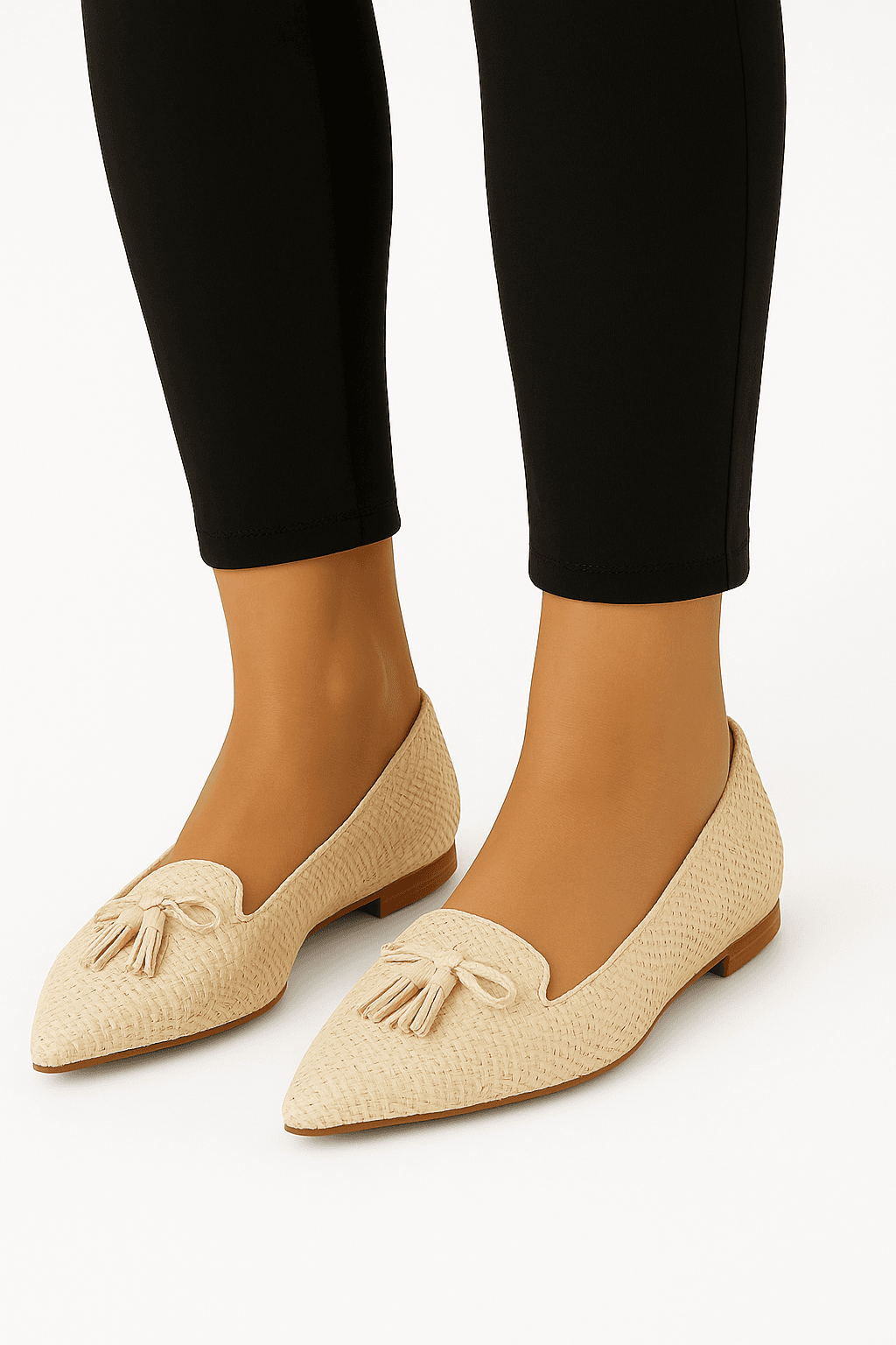 La punta leggermente affusolata slancia la silhouette del piede, mentre il piccolo fiocco con nappine aggiunge un dettaglio femminile e sofisticato. Morbida, traspirante e versatile, è la scarpa ideale per accompagnare look casual chic, abiti leggeri o pantaloni dal taglio slim.
