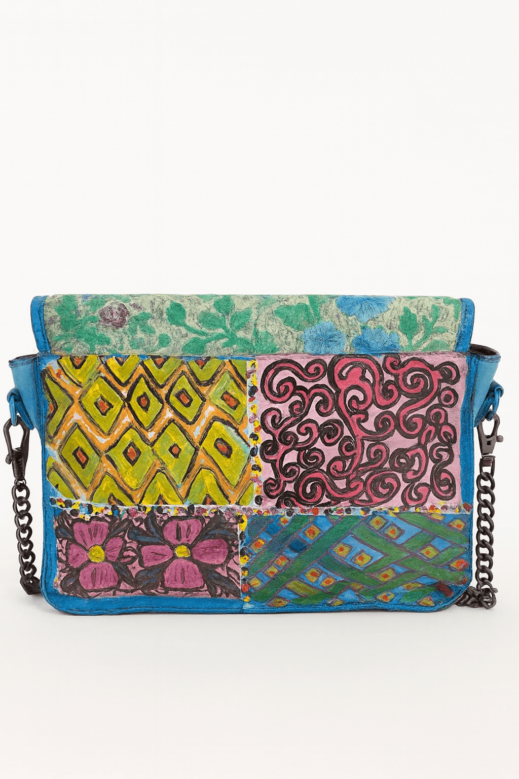 Un vero pezzo d’arte da indossare. Questa borsa in pelle di alta qualità è interamente dipinta a mano, rendendo ogni modello unico e irripetibile. I motivi geometrici e floreali si intrecciano in un’esplosione di colori vivaci che donano personalità e carattere a qualsiasi outfit.