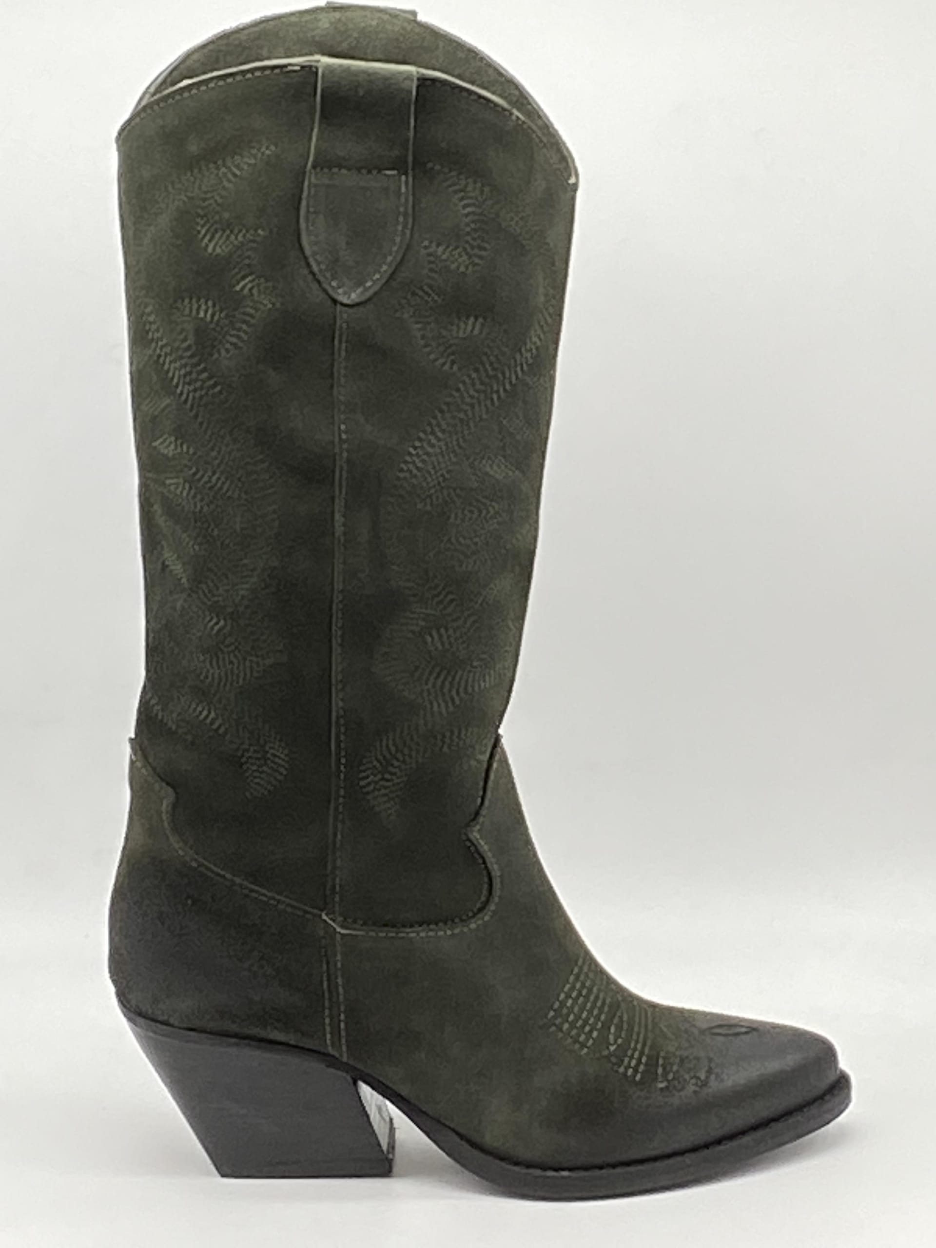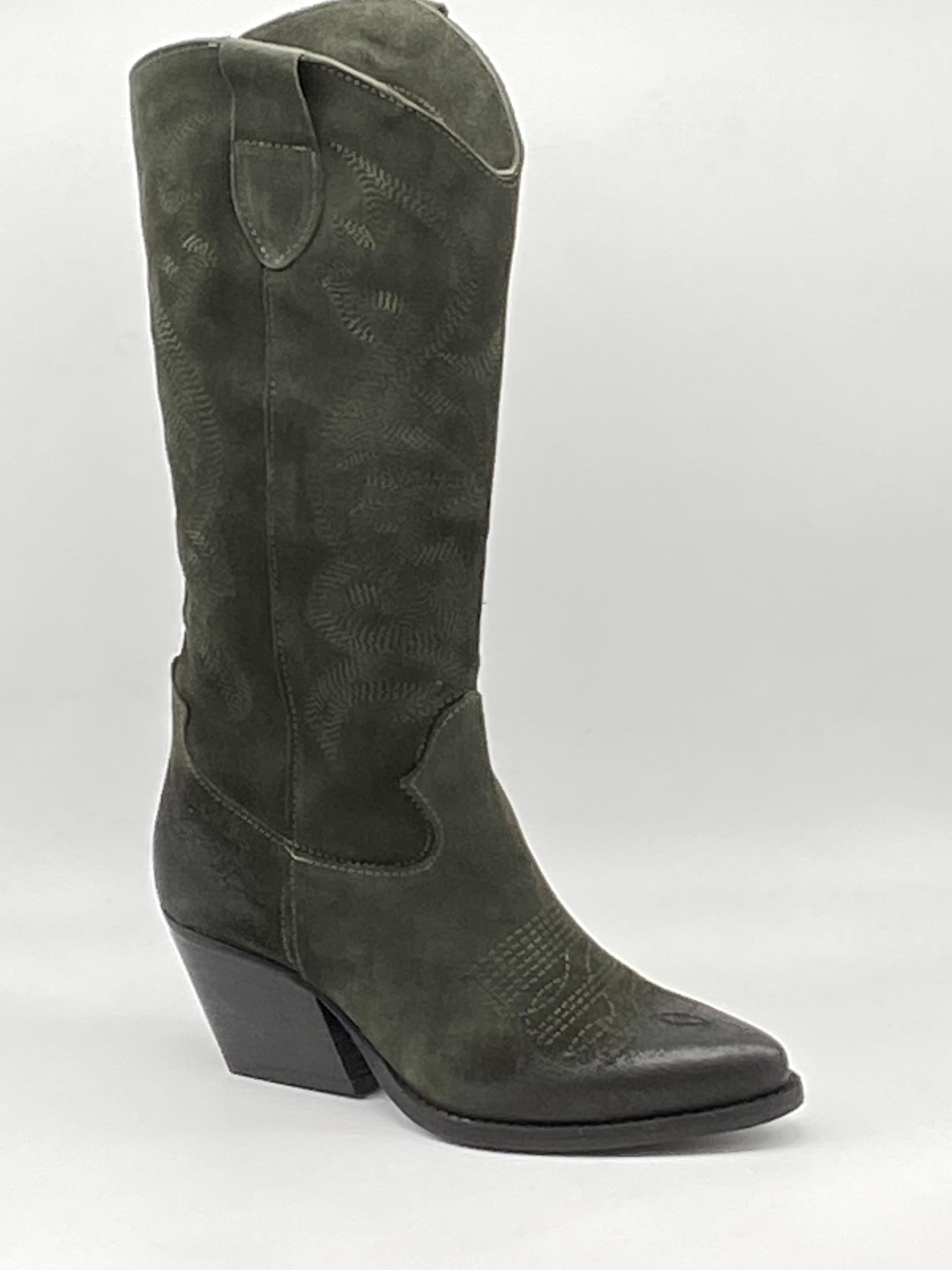 Il modello ART.7035 è un camperos dal carattere deciso e contemporaneo, realizzato in camoscio verde con raffinati ricami tono su tono che ne valorizzano la linea. La punta leggermente affusolata e il tacco medio inclinato donano un look grintoso e femminile, perfetto per chi cerca una calzatura versatile da indossare in diverse occasioni.