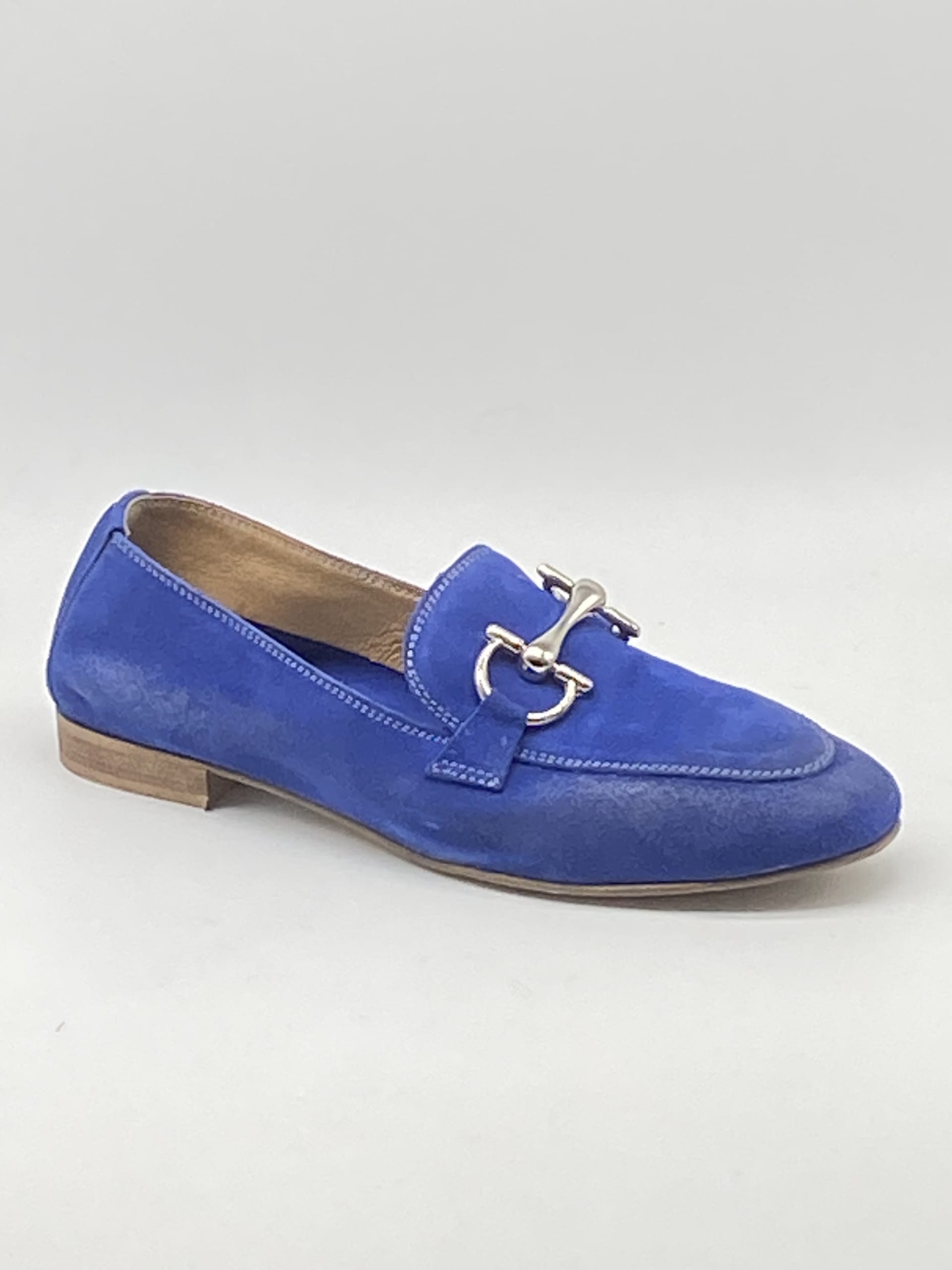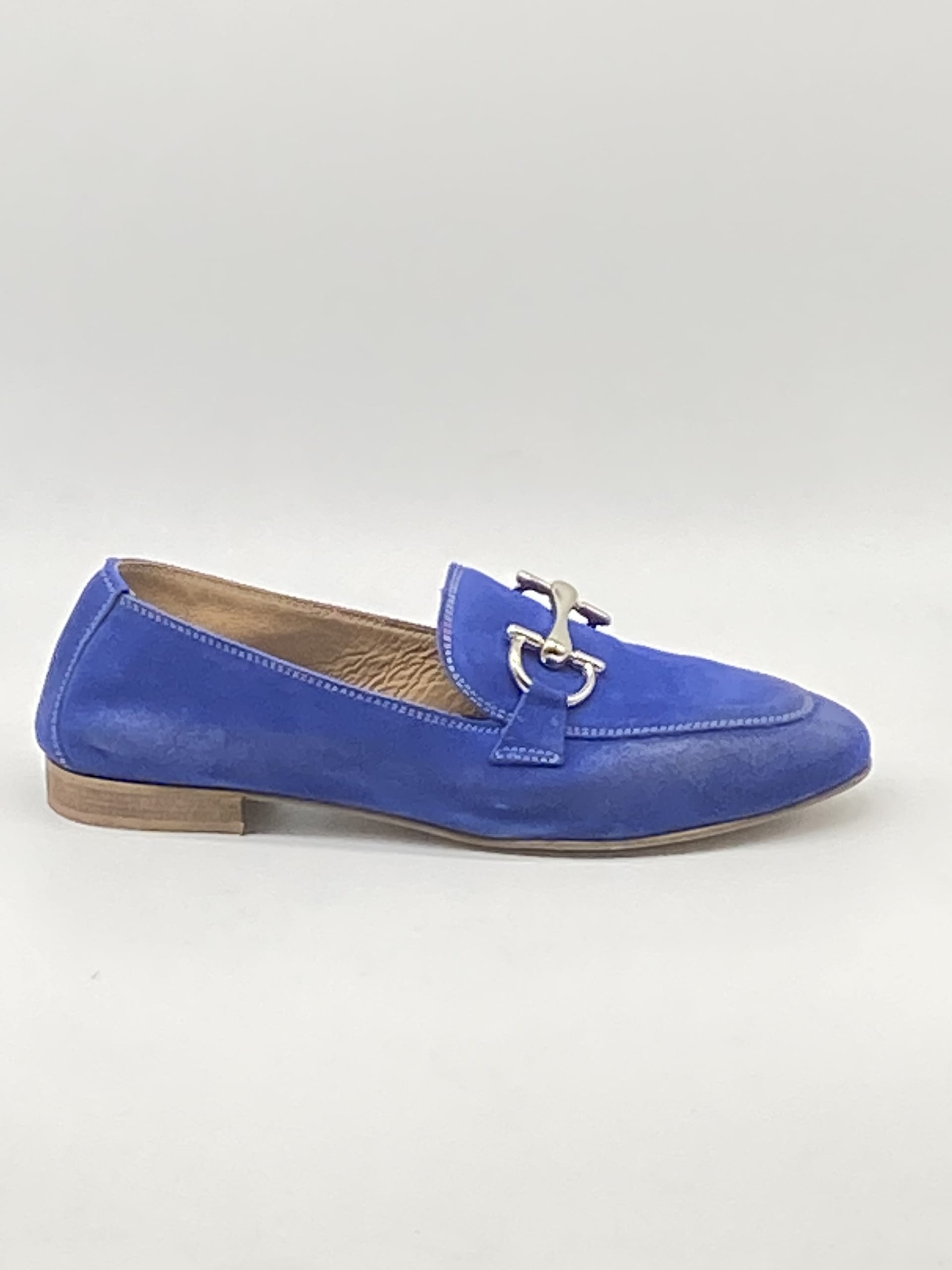 Questo mocassino ha la punta tonda e una scollatura morbida. Questa versione è in morbida pelle scamosciata bluette, per un tocco di grinta e femminilità in più. Il tacco di 1 cm di altezza, slancia con eleganza la scarpa e fornisce un comodo sostegno alla calzata. La fodera è in vera pelle dai toni nude e il sottopiede in pelle imbottito.
