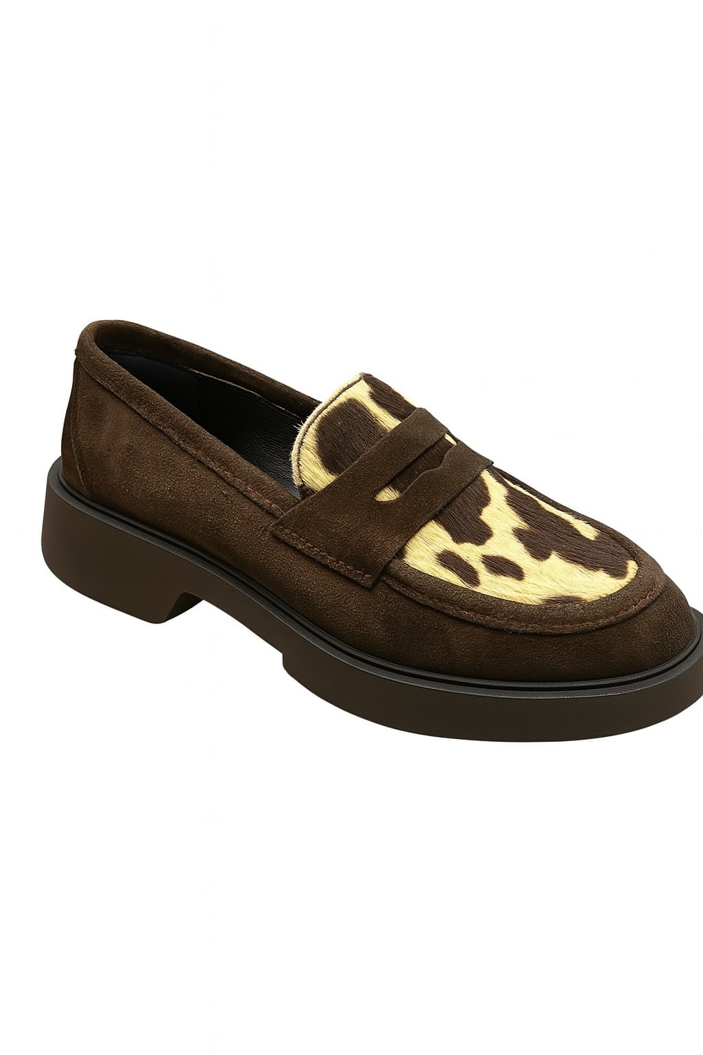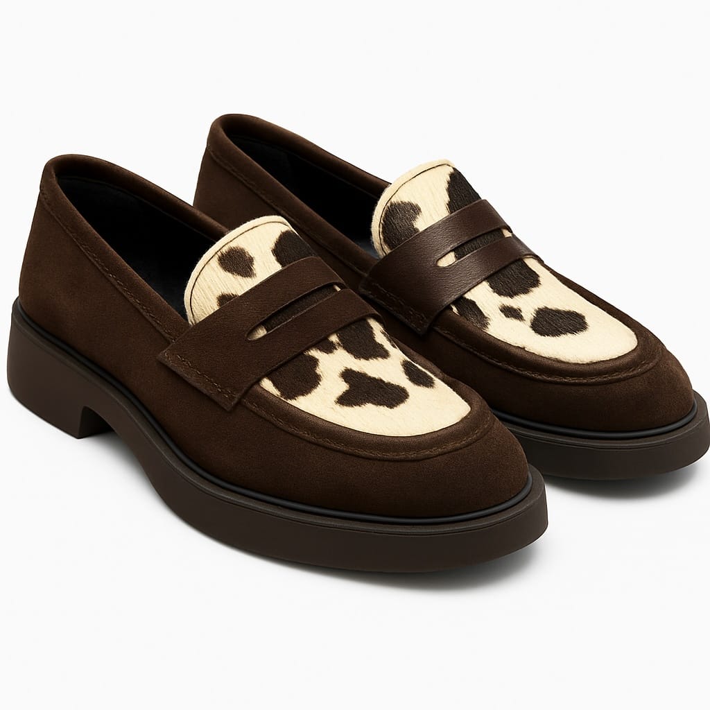 Un mocassino dallo stile deciso e contemporaneo, realizzato in camoscio testa di moro di alta qualità e impreziosito da un inserto in cavallino con stampa maculata. Il design è essenziale ma ricercato, con una mascherina classica e una suola in gomma robusta che dona carattere e comfort alla calzatura. L'interno è foderato in pelle per garantire traspirabilità e morbidezza al piede.